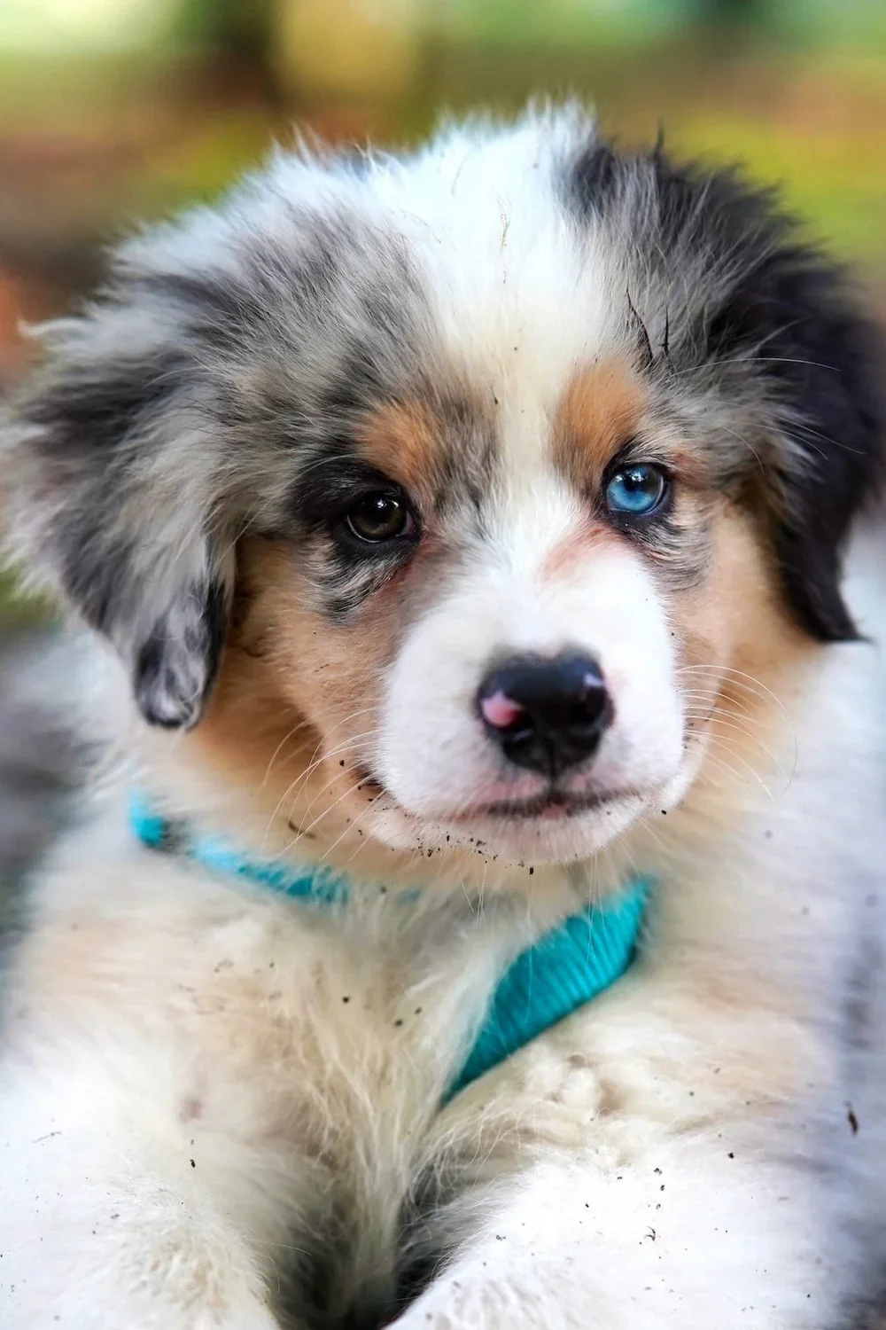 • Close-up of an Australian Shepherd puppy with heterochromia, one blue eye and one brown eye, lying on the ground with dirt on its face and chest, wearing a blue collar.