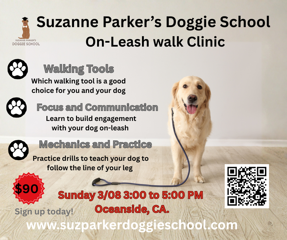 Suzanne offers in-person dog training across North San Diego County and South Orange County, California. Training sessions take place in the same real-life settings where you and your dog live, walk, and play—so the skills actually stick.